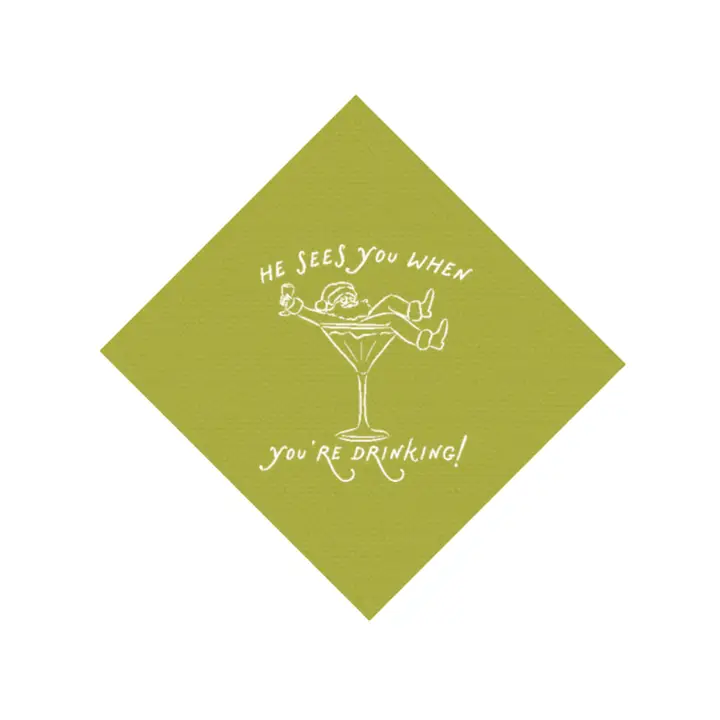 Holiday gatherings call for good drinks, good laughs, and maybe a little light supervision from Santa himself. These festive cocktail napkins bring playful holiday humor to parties, family get-togethers, and seasonal celebrations. With a fun illustrated design on a kiwi-green background, they add the perfect touch of cheer (and mischief) to every sip.