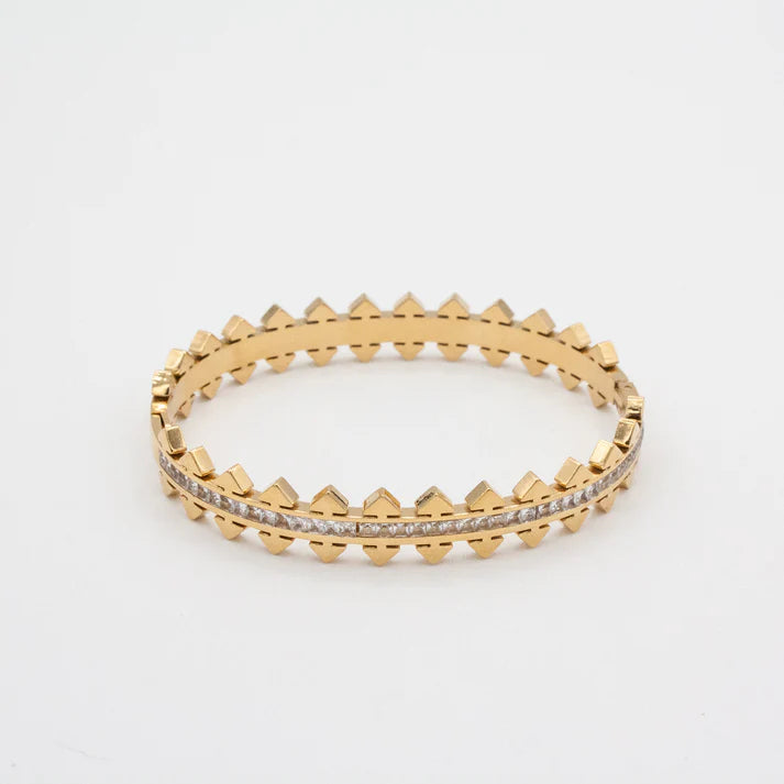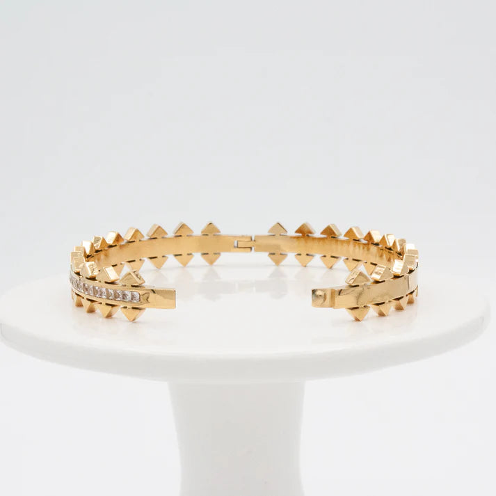 Bold meets effortless luxury. The Monaco Stacker Bracelet features striking spiked detailing and hand-set crystals that catch the light like sunset on water. Designed with a sleek hinge and magnetic closure, it’s made for easy, secure wear — just press gently on one side to open.
