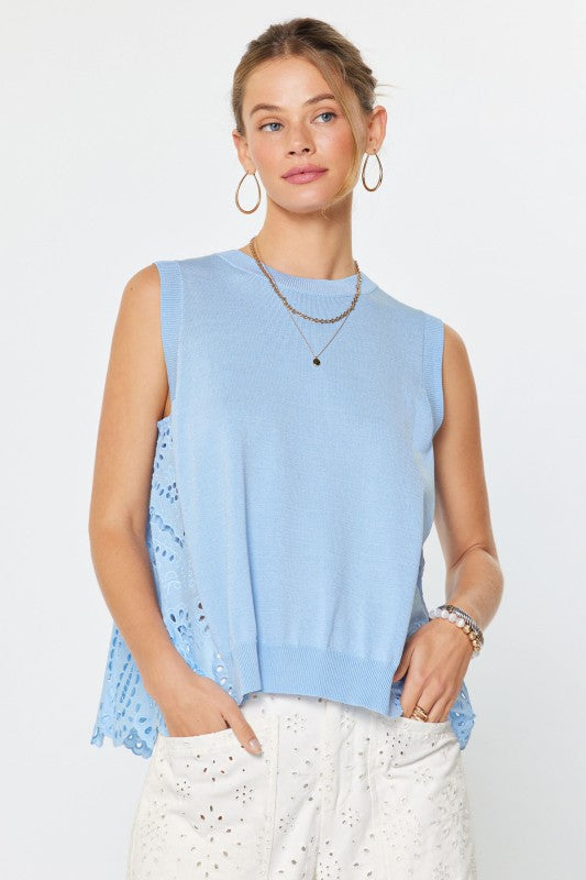 Regular price $88.00 Save $0.00-Sleeveless knit vest -Round neckline with ribbed trim -Solid sweater front -Pleated eyelet back with scalloped hem -Mixed material design -Relaxed fit -Hand wash cold separately, lay flat to dry