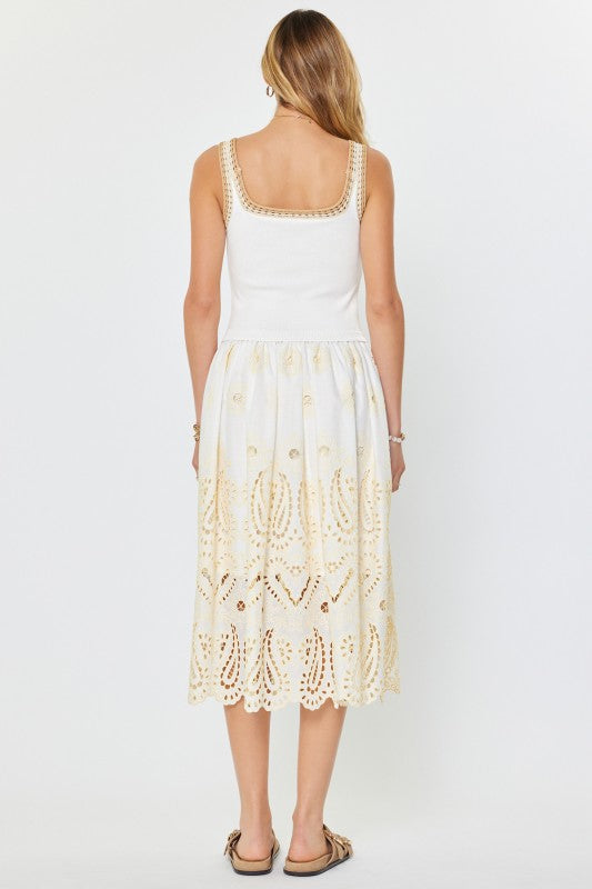 Regular price $128.00 Save $0.00Sweater top and woven skirt combo dress -Square neck and sleeveless sweater top -Contrast crochet detail -Eyelet embroidered woven skirt -Flared a-line midi length -Scallop edge hemline -Hand wash cold with like colors