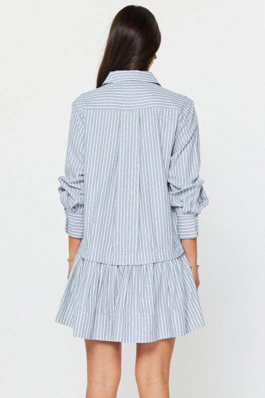 Regular price $138.00 Save $0.00-Stripe pattern with rhinestone detail -Classic point collar -Button-down front -Oversized, relaxed fit -Long sleeves with roll-tab styling option -Drop-waist -Tiered mini skirt with high-low hem detail -Gentle cycle wash in cold water
