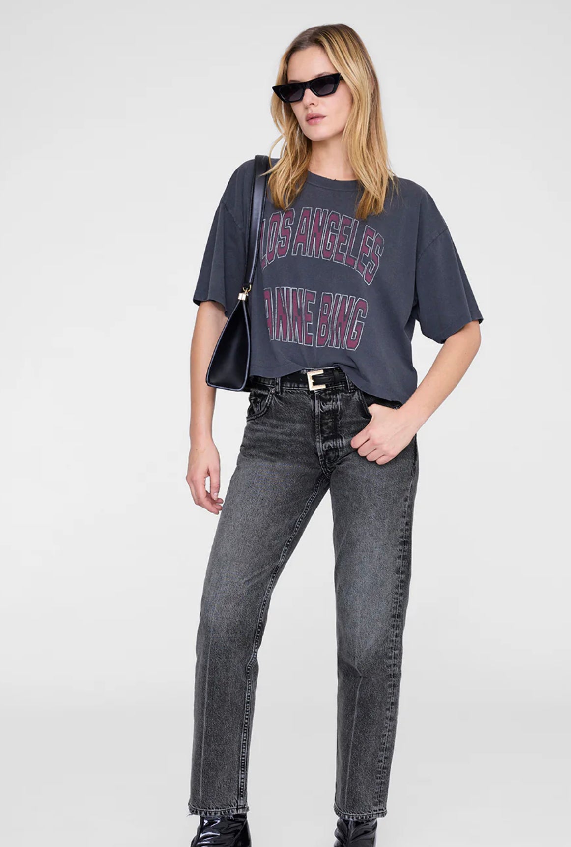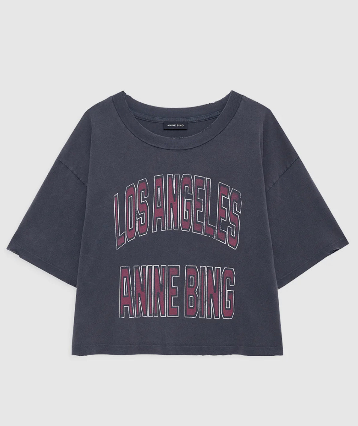 A vintage-inspired cropped tee made from a midweight 100% cotton jersey fabrication in washed black. - Cotton jersey - Boxy, structured fit - Cropped hem - Faded red `LOS ANGELES ANINE BING` screen print graphic with white outline at front