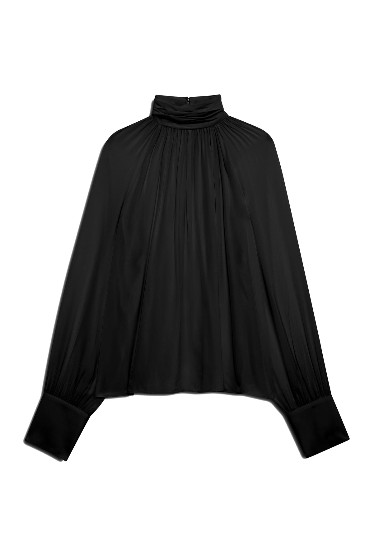 A minimal oversized bomber jacket made from a durable, slightly padded 100% polyester shell with a subtle sheen. - Polyester - Funnel neck - Relaxed, oversized fit - Ruching at cuff and sweep - Dolman sleeves - Flat on-seam pockets - Tonal interior lining - Brass hardware - Covered zipper pull down the center