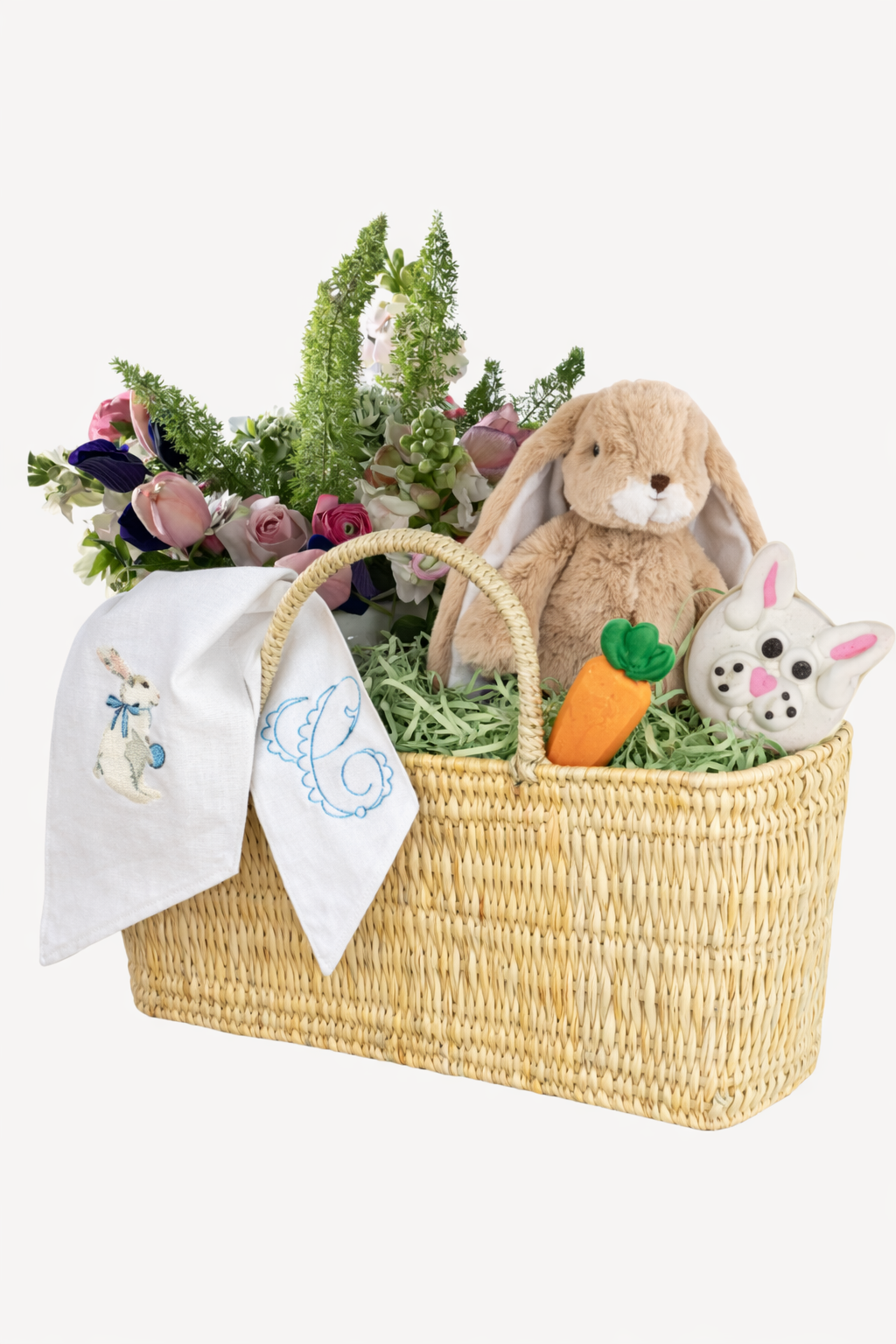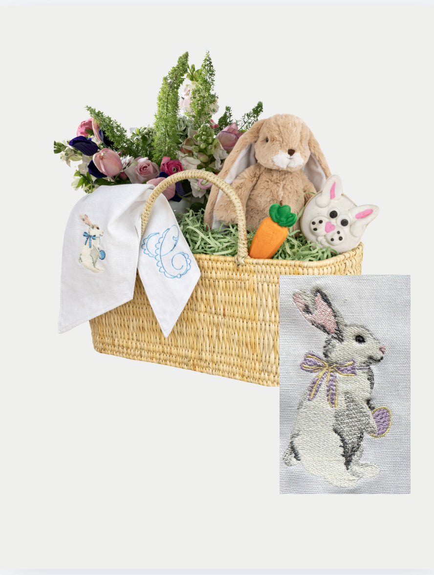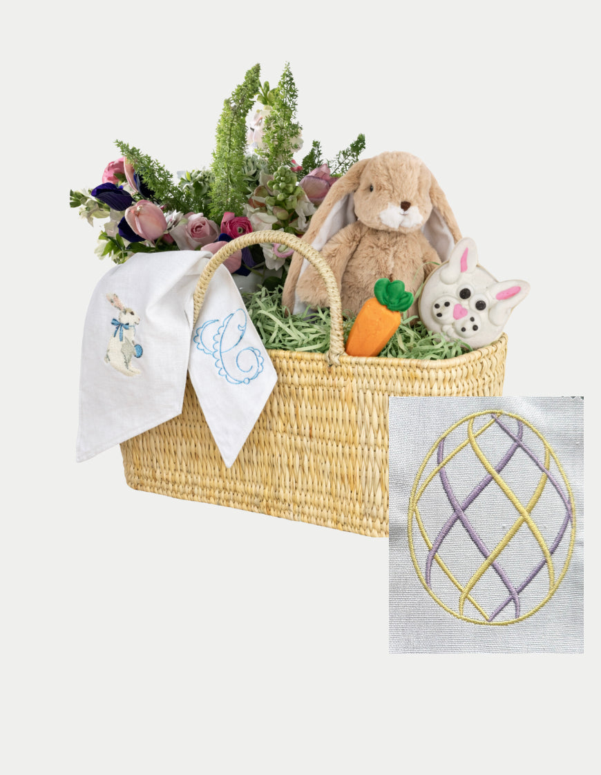 Your basket includes: • A woven Easter basket and plush bunny from THREAD • Six pre-decorated Easter cookies from The Original Goodie Shop • A custom monogrammed sash from The Stitcher Society, featuring your choice of a bunny or Easter egg motif with one initial. • A fresh floral arrangement from Vie De La Fete Florals
