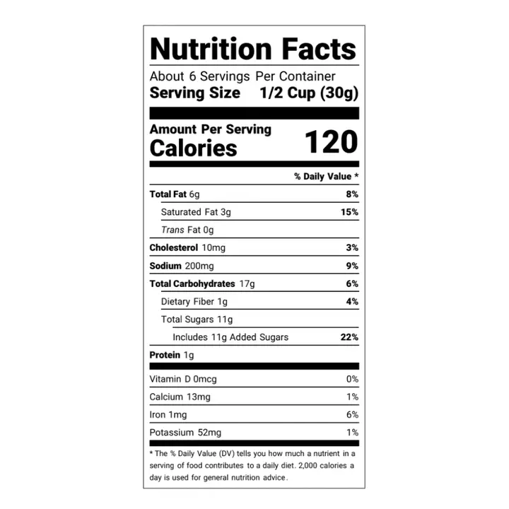 Brown Sugar, Non-GMO Popcorn, Non- GMO Corn Syrup (Corn Syrup, Salt, Vanilla Extract [Vanilla Beans, Water, Ethyl Alcohol]), Butter (Cream, Natural Flavor), Pecans, Almonds, Molasses, Dark Chocolate (Sugar, Cacao, Cacao Butter), Sea Salt, RBD Coconut Oil, Sunflower Oil, Sunflower Lecithin.