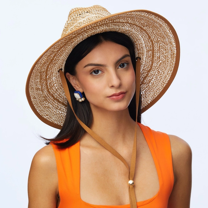 western inspired wide brim, straw hat. ∙ Tan and white woven straw ∙ Tan cord to tie under the chin or drape over the shoulder