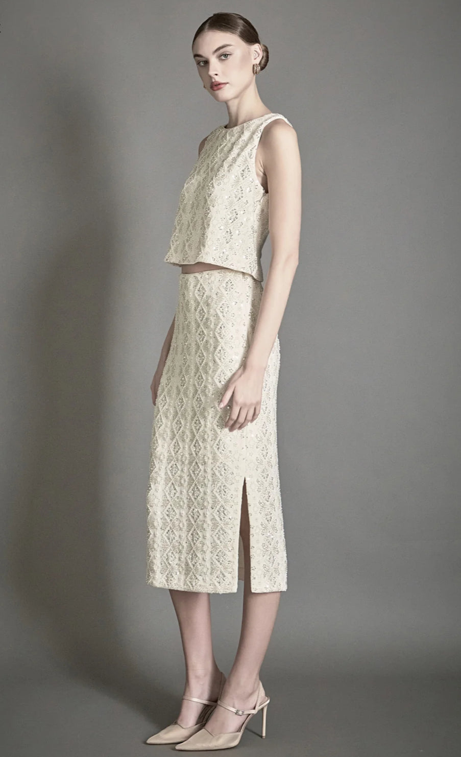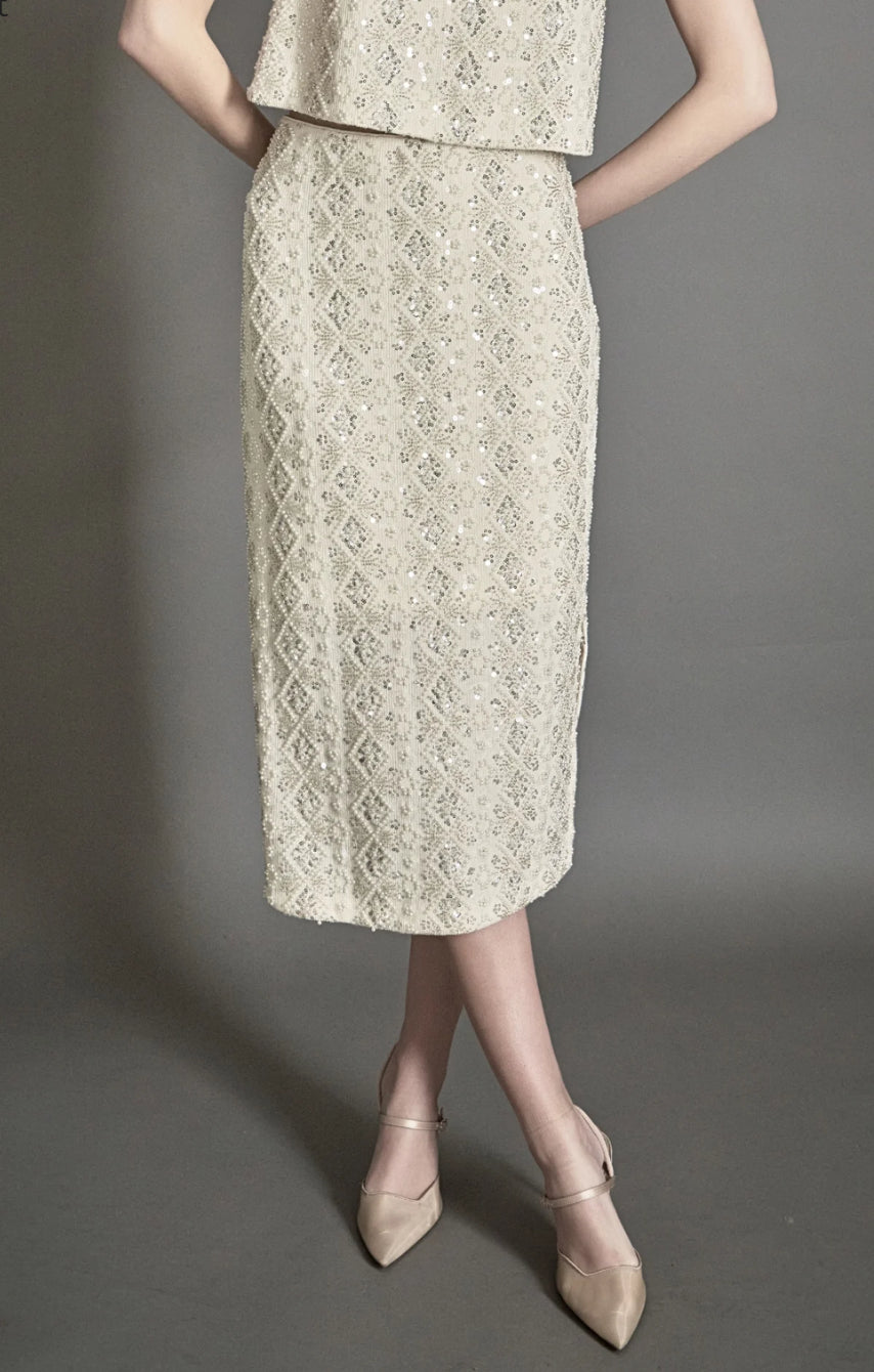 A striking statement piece for evenings out and elevated everyday style. Crafted with a high-shine finish and a fluid midi silhouette, the Elodie Mari Sequin Skirt brings effortless elegance to any look. Its smooth lining ensures comfort while the shimmering exterior adds a sophisticated touch of glamour.