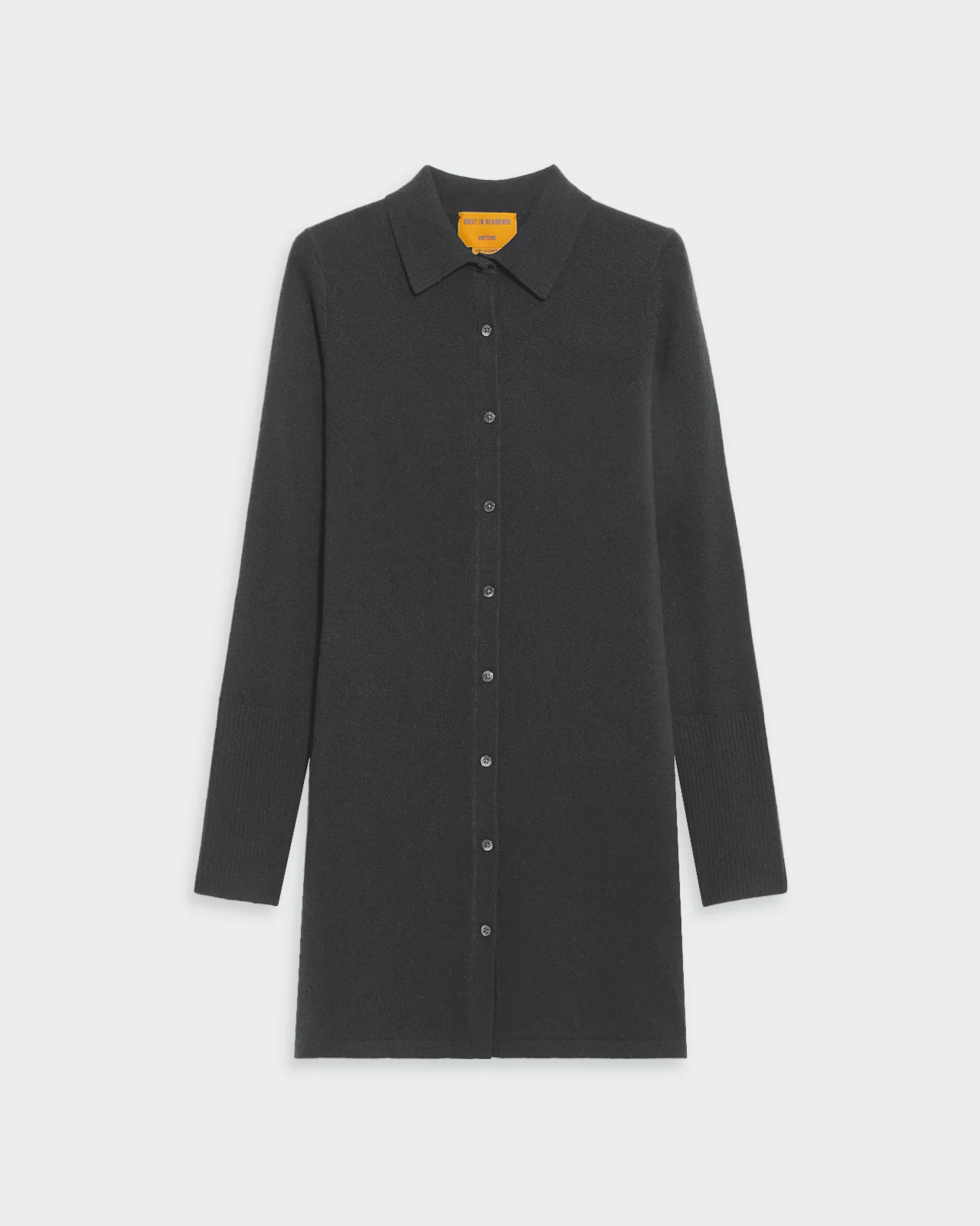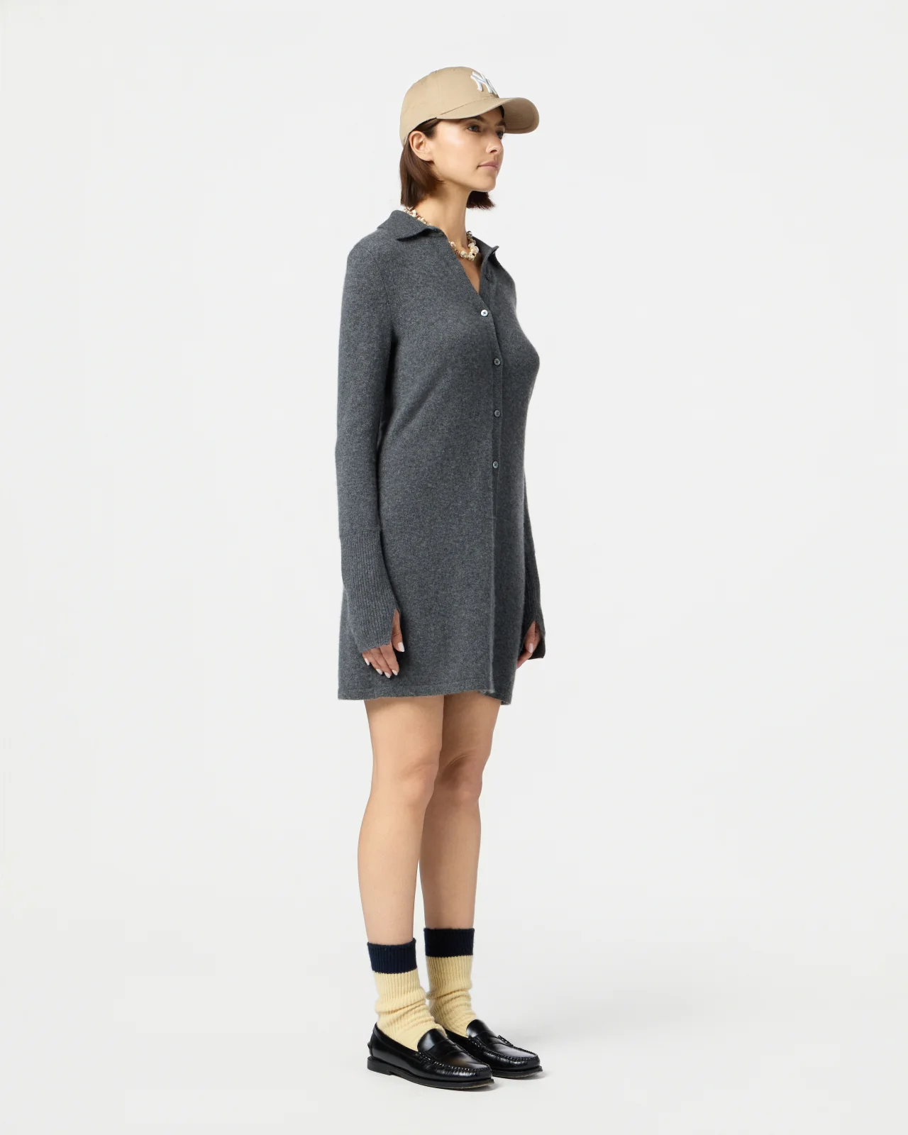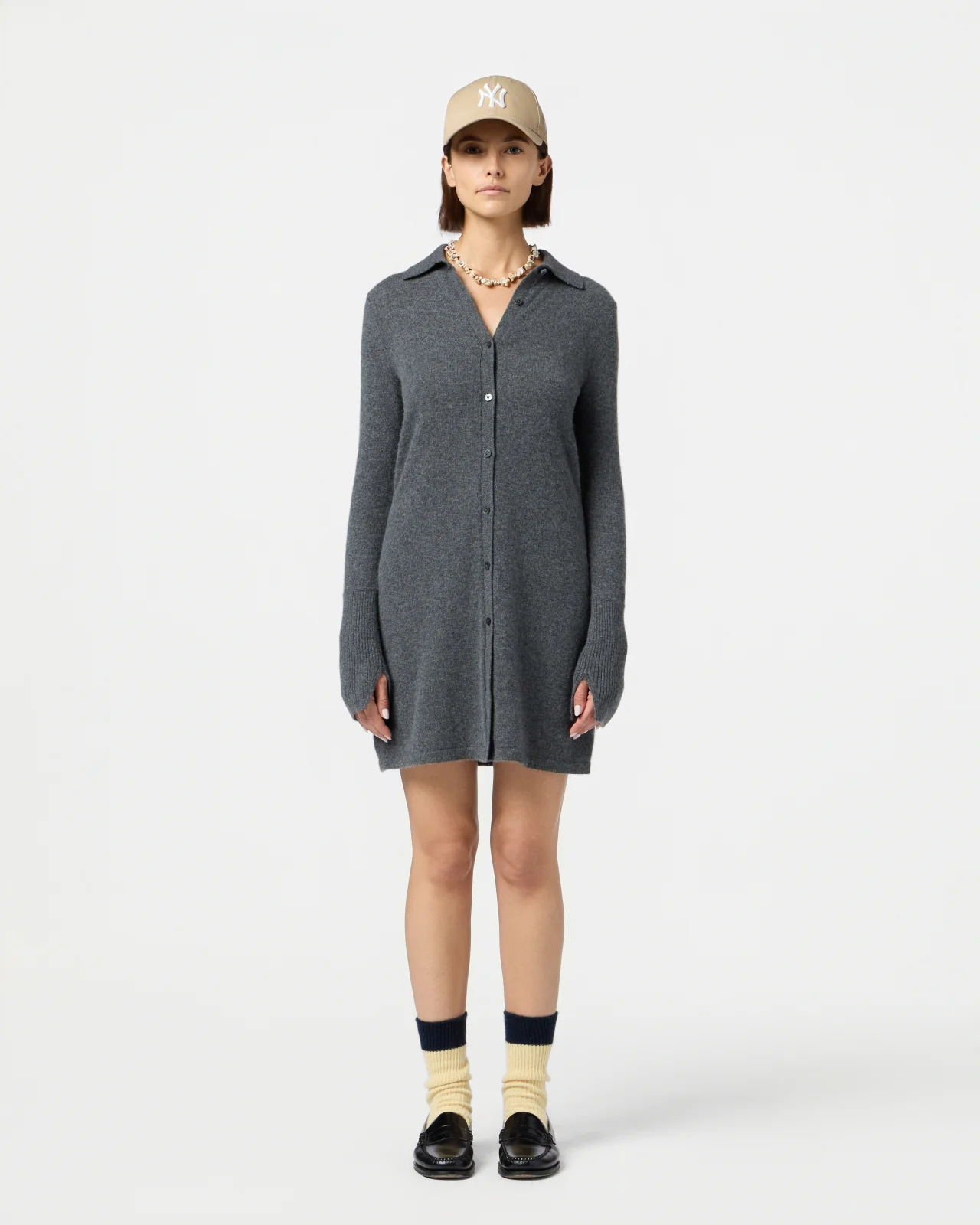 Effortless, refined, and irresistibly soft — the Mini Showtime Shirt Dress is crafted from lightweight cashmere jersey for a draped, luxurious feel. This mini-length silhouette blends classic shirting elements with elevated knit details, including a structured collar, rib-knit sleeve cuffs with a subtle vent, and a clean tubular hem. Polished enough for going out and comfortable enough for everyday wear, it’s the perfect balance of minimal, modern, and chic.